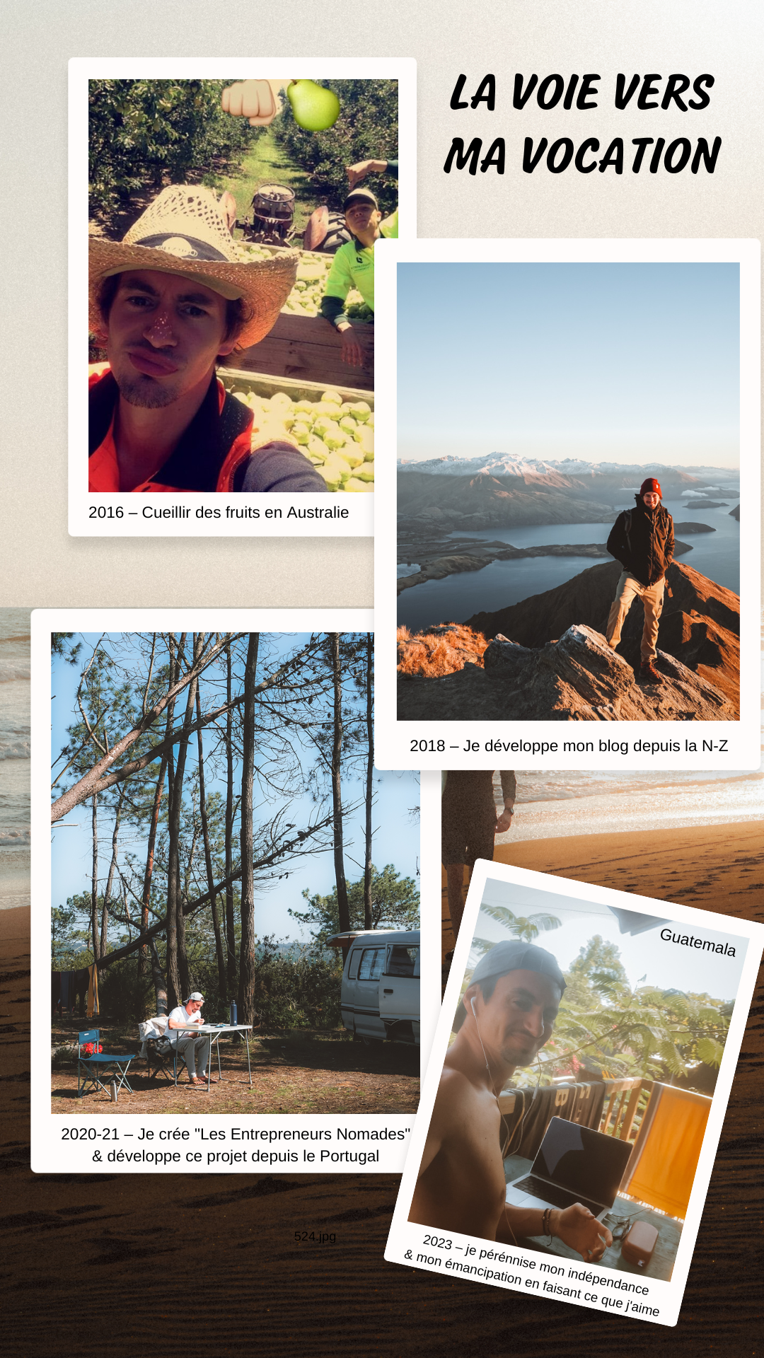 Depuis fin 2015 et mon CDI quitté pour mes PVT en Australie, j'ai pérénnisé un mode de vie alternatif, nomade.